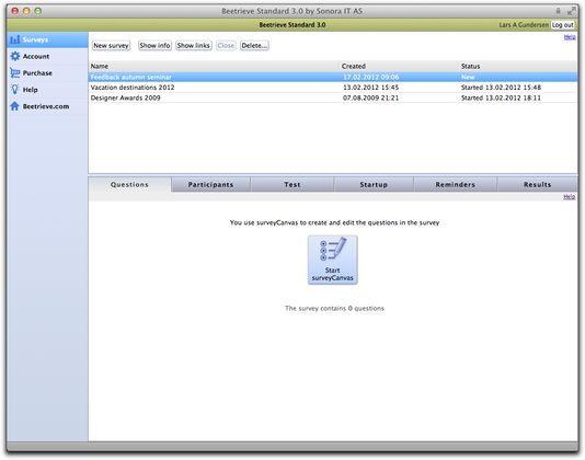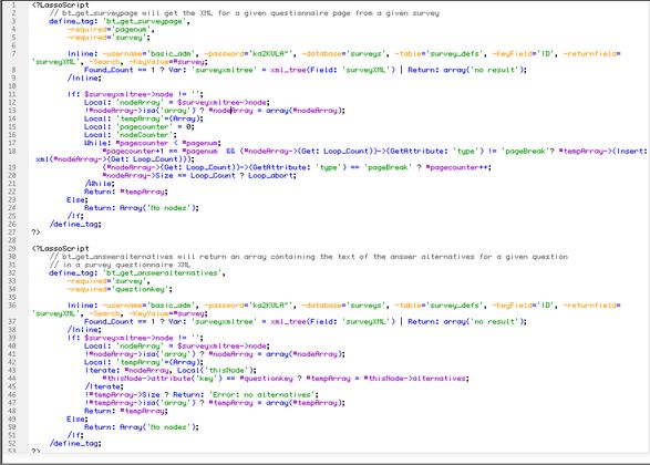 Beetrieve is a reinvention of the survey web service, made into an intuitive web app with an email-like interface. Probably the coolest coding happens in the completely AJAX based module for creating the questionnaire, where the JavaScript front end and the Lasso back end together manipulate and synchronize the XML structure that defines the questionnaire. This XML is then parsed by Lasso into HTML to show to a survey participant when the survey is live.