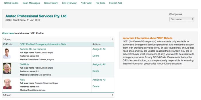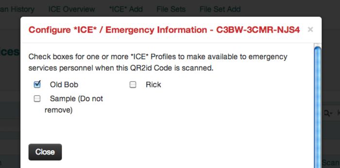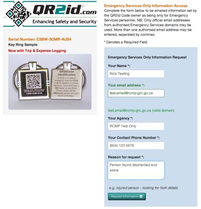 *ICE* Profiles can be attached to any QR2id Codes in the user's account. A shared QR2id Code, such as on a key ring, can have multiple *ICE* Profiles attached. When a QR2id Code is scanned and there is an associated *ICE* Profile, a message to emergency services is displayed with a link to a simple form to retrieve the *ICE* Profile information.